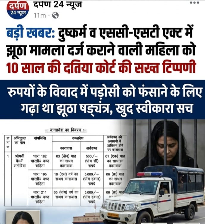 दतिया न्यायालय का यह फैसला स्पष्ट संदेश देता है कि कानून का दुरुपयोग करने वालों को बख्शा नहीं जाएगा। झूठे आरोप लगाकर किसी निर्दोष को फंसाने की कोशिश न केवल अपराध है, बल्कि इसके गंभीर कानूनी परिणाम भी भुगतने पड़ सकते हैं।