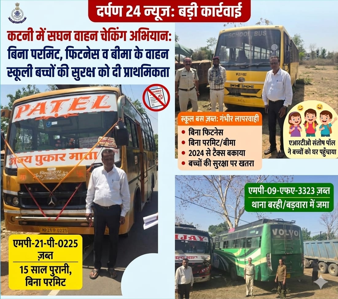 कटनी में सघन वाहन चेकिंग अभियान: बिना परमिट, फिटनेस व बीमा के वाहन जब्त, स्कूली बच्चों की सुरक्षा को दी प्राथमिकता