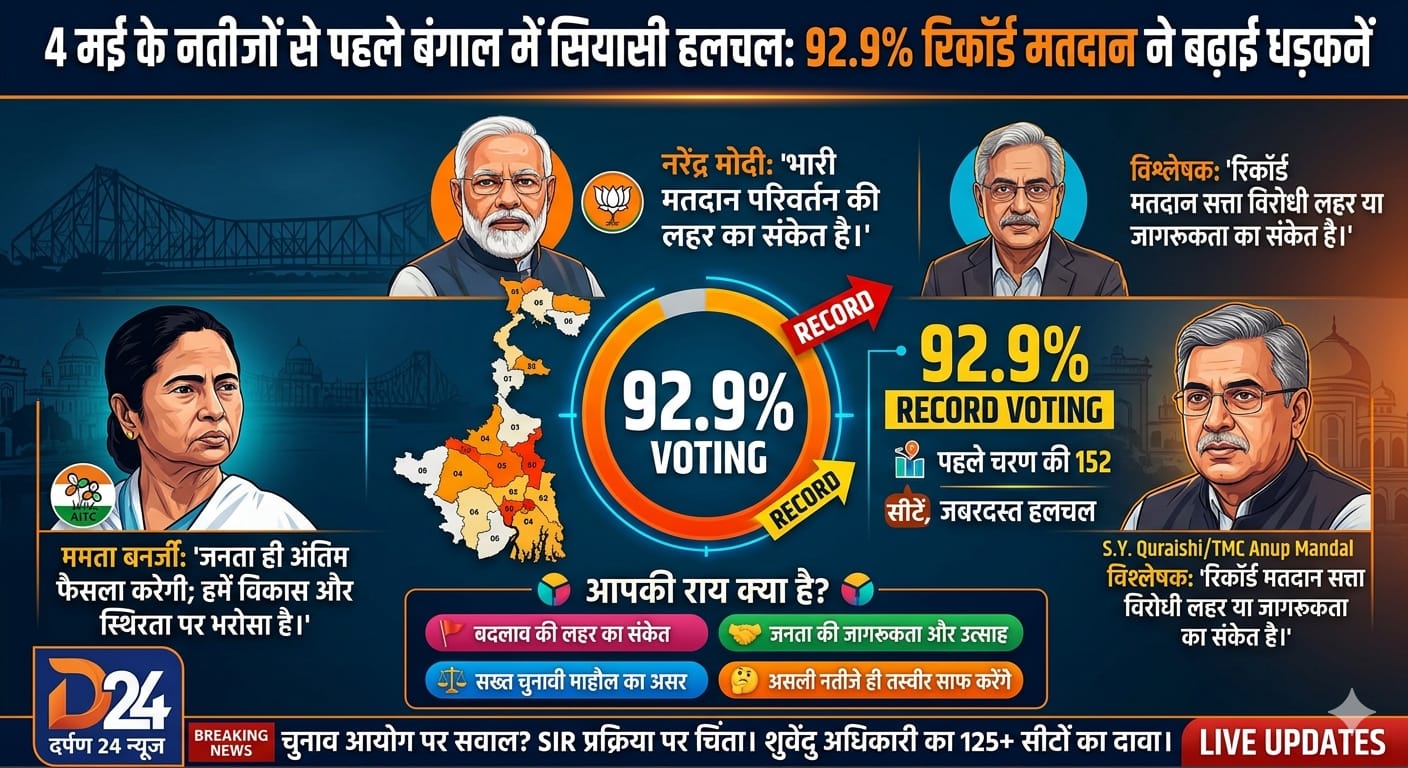 4 मई के नतीजों से पहले बंगाल में सियासी हलचल: 92.9% रिकॉर्ड मतदान ने बढ़ाई धड़कनें